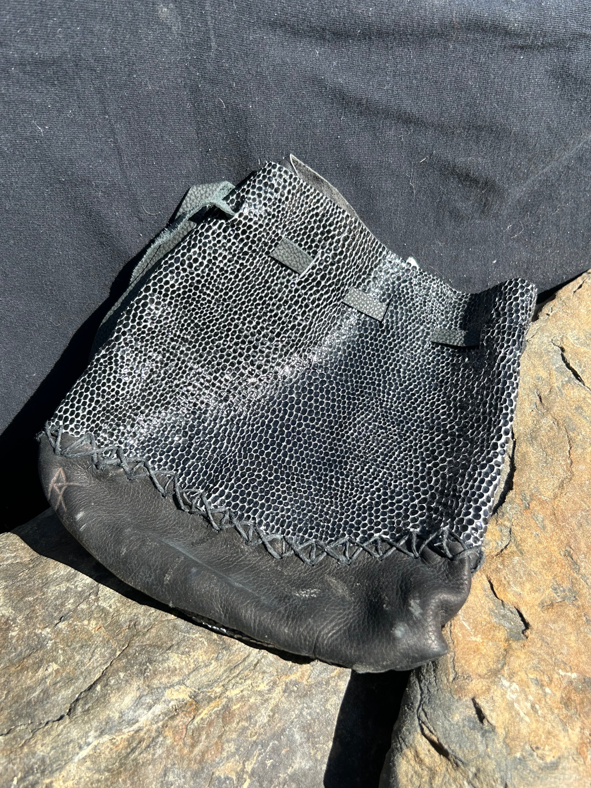 Tailored to be as spacious as a quart-sized bag, providing ample room for runes, tarot decks, or other cherished items. The pouch is expertly stitched using black dyed hemp twine, enhancing their durability while adding a touch of artisanal charm.