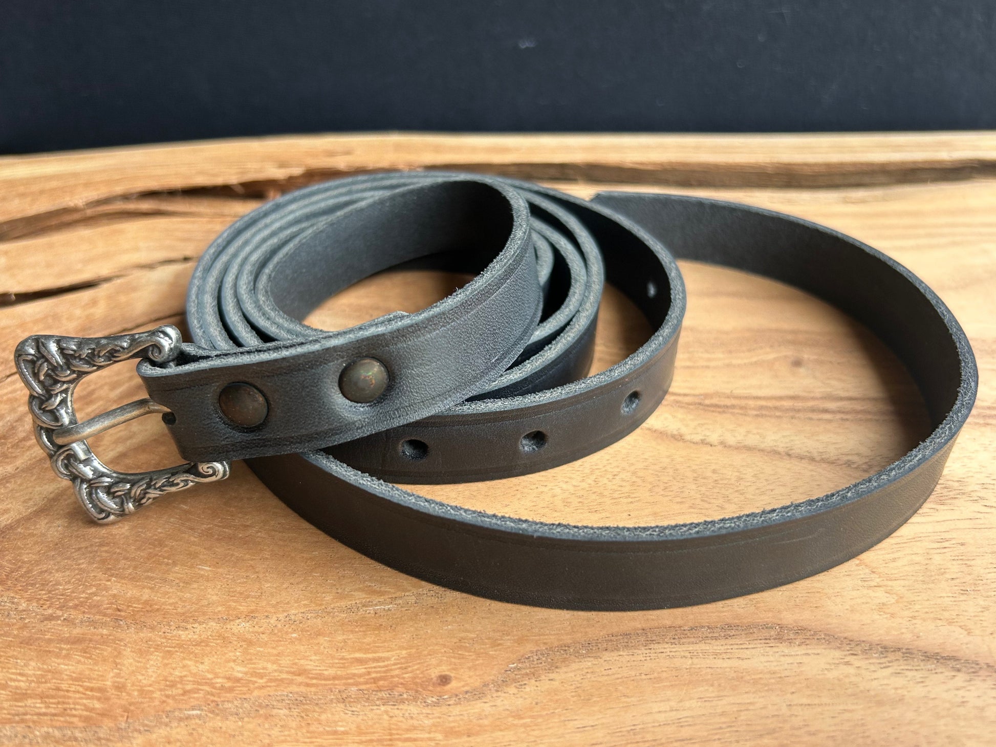 This extra long leather belt features historically accurate buckle based on a 10th century Anglo-Saxon discovery. The belt has a width of 3/4" and a length of 71", complete with a sleek silver finish buckle. The holes in the belt range from 39"-46", but can be adjusted as needed.