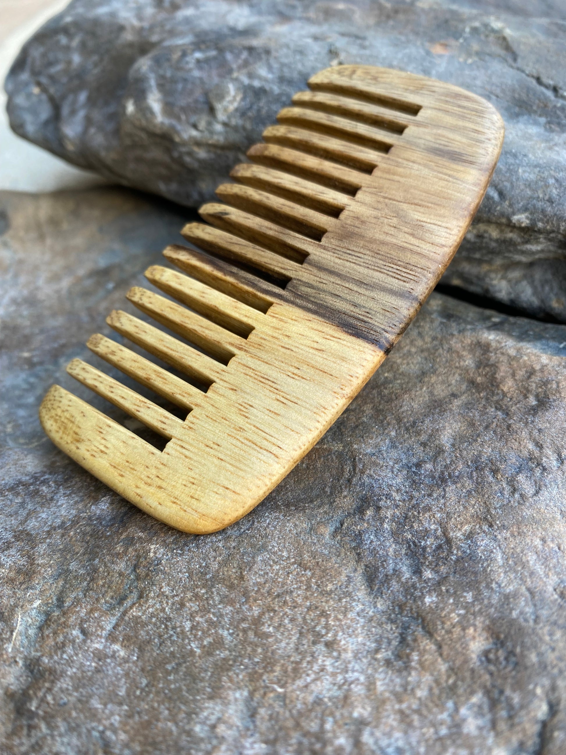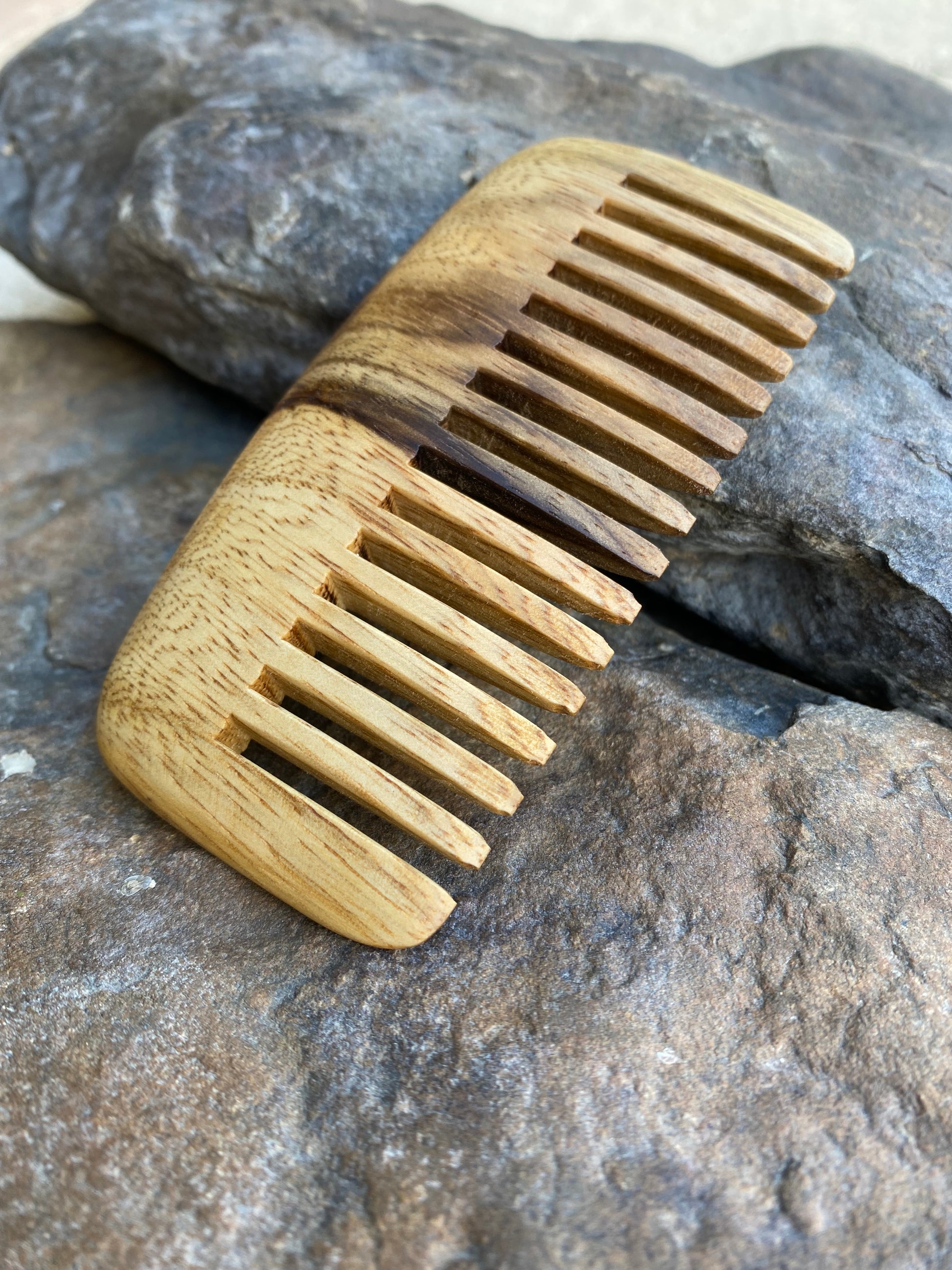 This beautiful, handcrafted wooden comb is made from a solid piece of Black Limba Wood.
