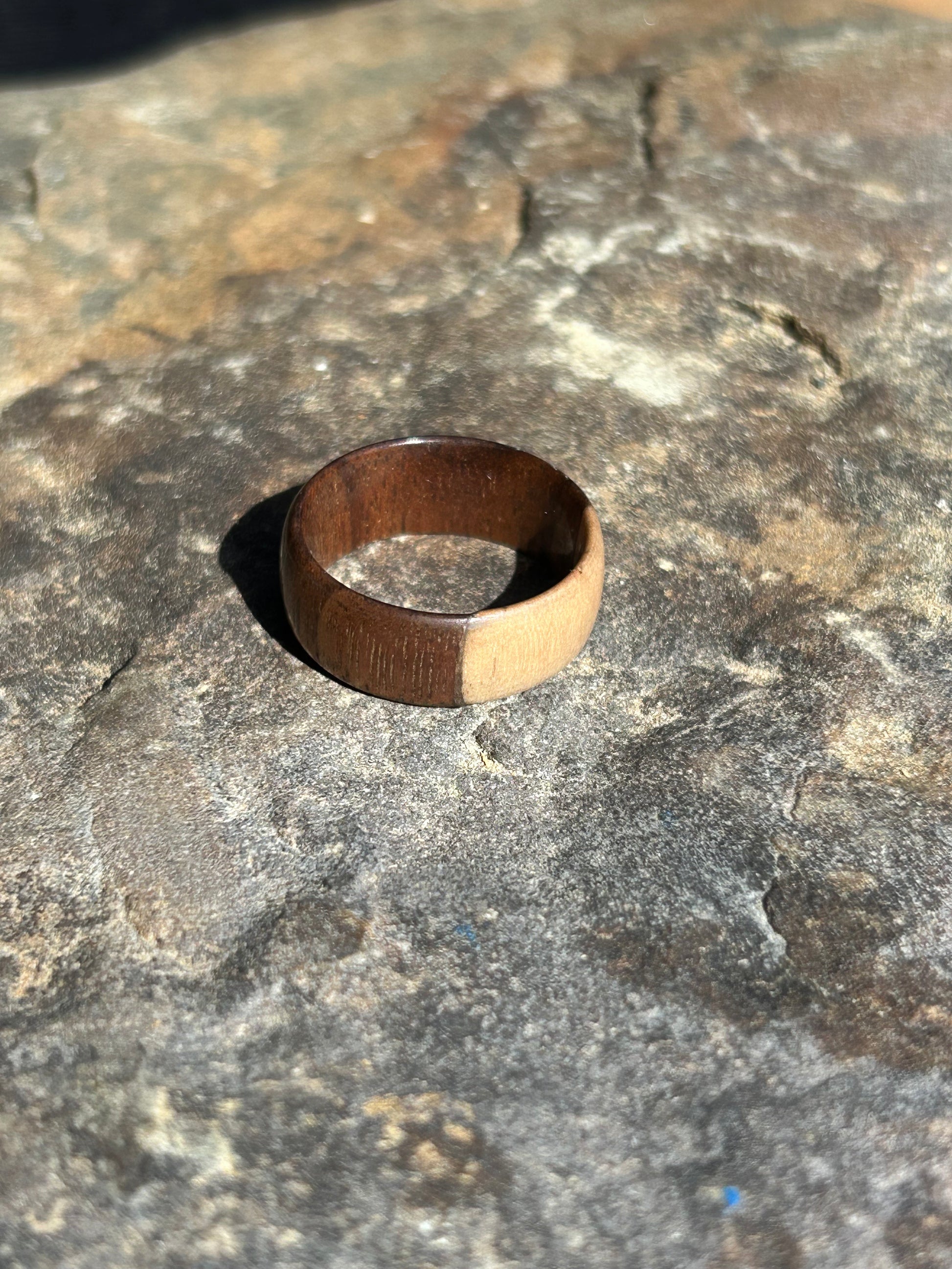 This Black Walnut and Maple Ring was turned and hand-crafted by our resident artist, Gustrad The Red.