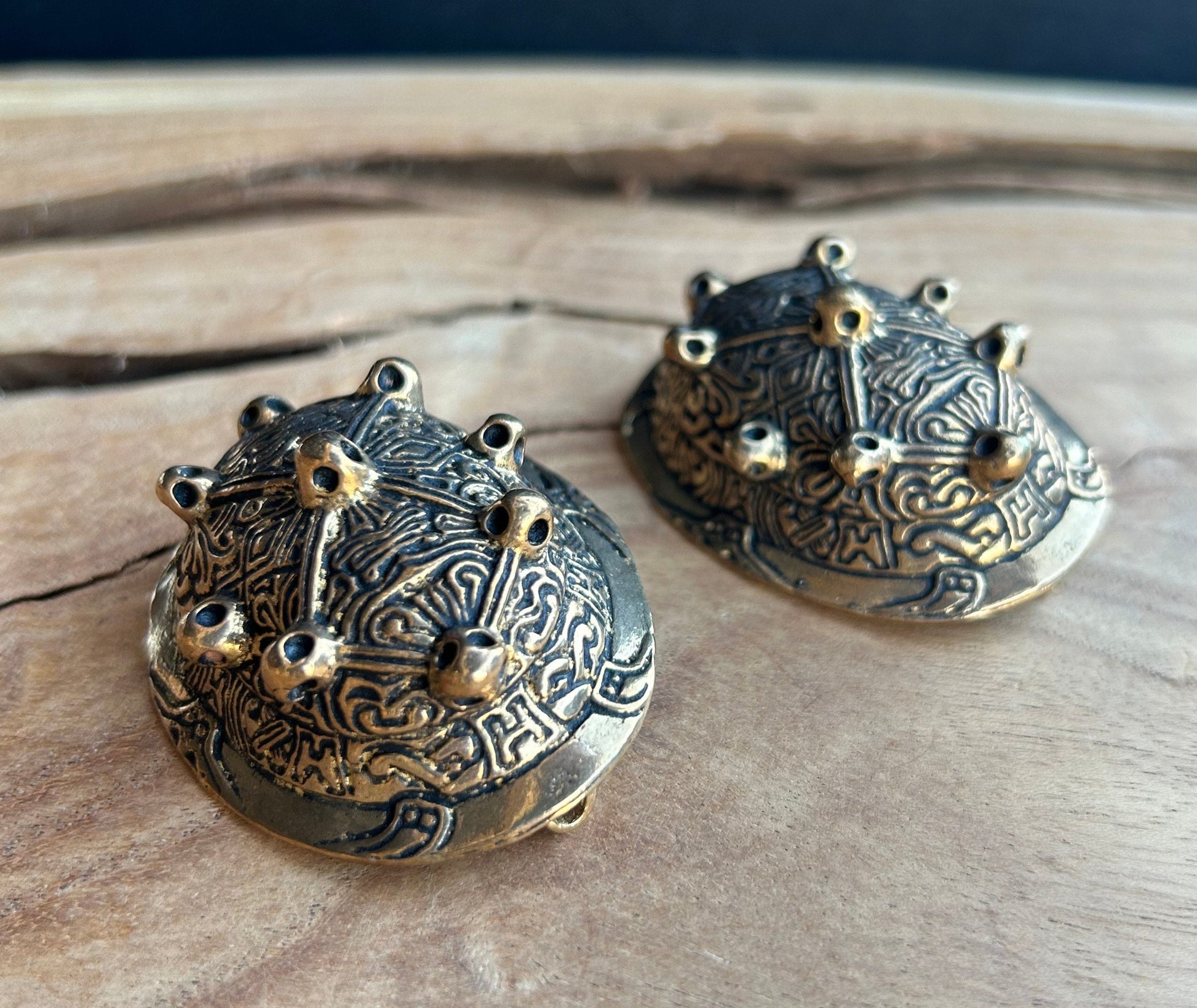 Transformed into wearable art, these stunning bronze tortoise shell brooches are meticulously crafted to showcase their intricate details. These timeless pieces, inspired by the ancient Saltvik findings from Finland, measure approximately 2 1/4" in length and 1 1/2" in width. Experience the allure of centuries past with our Bronze Tortoise Shell Brooches.