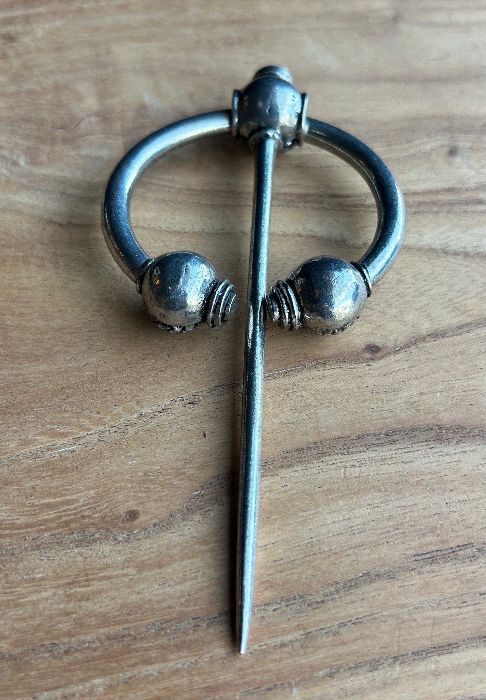 This brooch is inspired by Irish and Viking cultures, specifically the thistle brooches that originated in Ireland and were adopted by the Vikings. It is crafted in Scotland using lead-free pewter, with the pin measuring 5 1/2" in length and the brooch 2 3/4" in width.