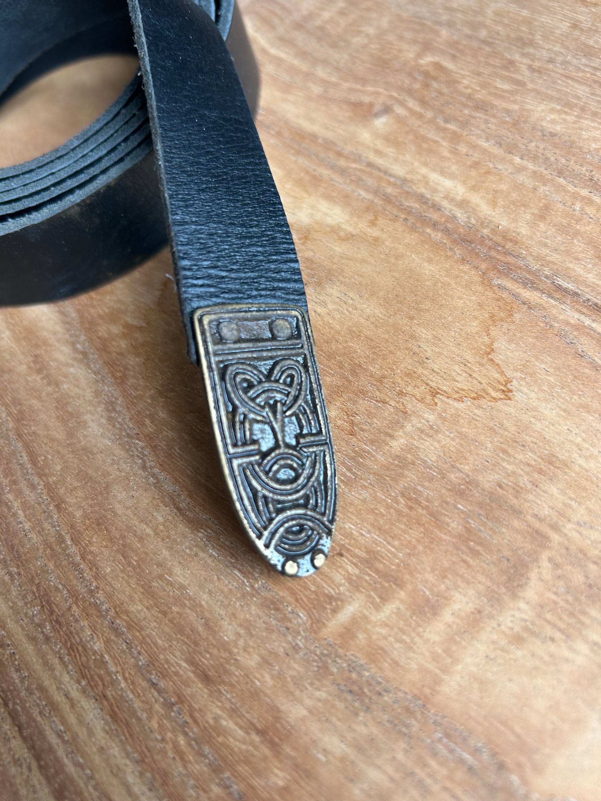 This Norse Jarl Belt features sleek black leather and sturdy brass fittings. Measuring at 3/4" wide and 65" long, it is an accurate representation of the popular belt style during the Viking age.