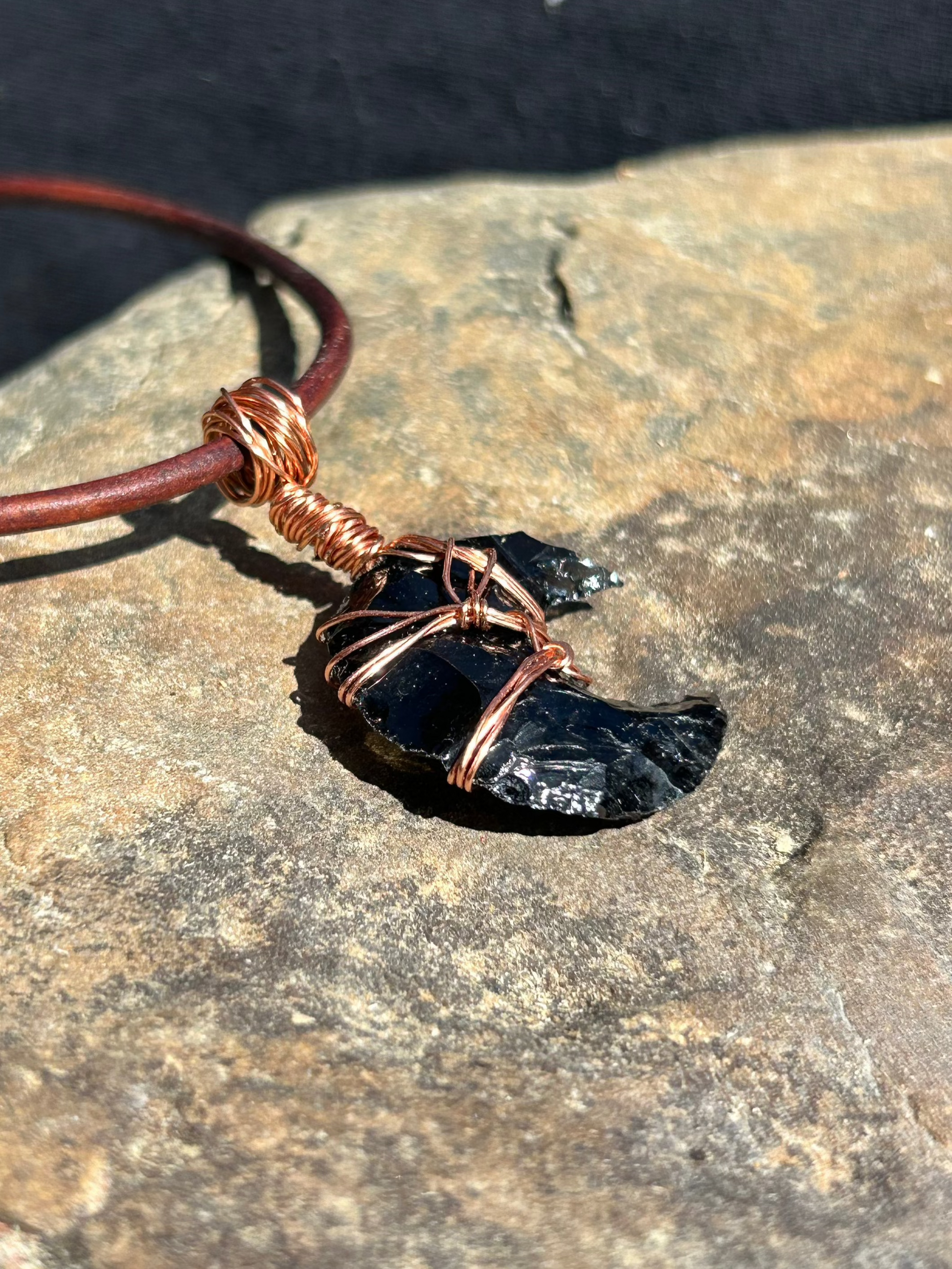 The obsidian's glossy, jet-black appearance provides a striking contrast against the aged copper wire that wraps each moon, enhancing its Gothic allure. The copper is treated to have an antique finish, giving the pendants an old-world charm that resonates with historical depth and magical integrity.
