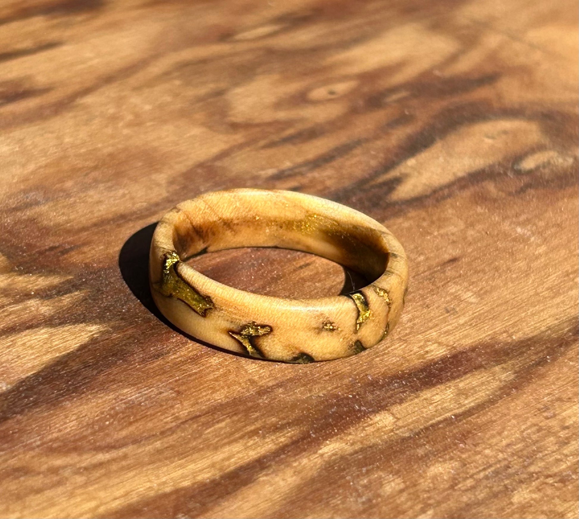 This Olive Wood Ring with Gold Epoxy Inlay was hand-crafted by our resident artist, Gustrad The Red.