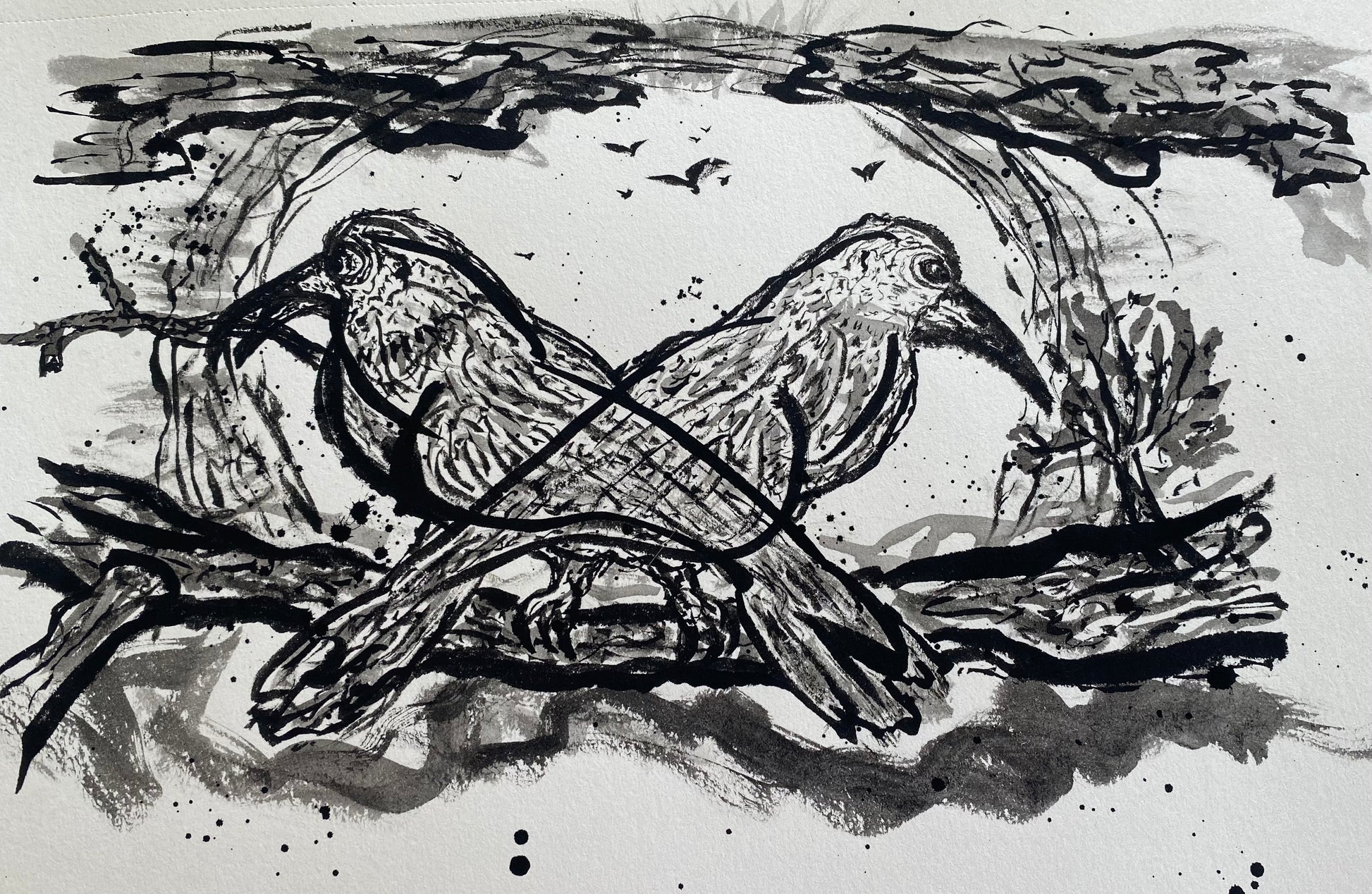 "Raven's in the Evening" - (9"x12") Hand Painted Black Art - Original