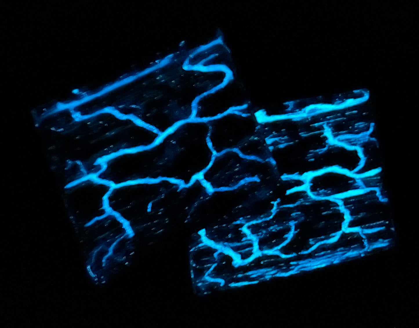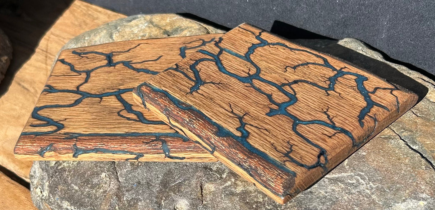 These Red Oak Drink Coasters have been fractal burned by hand and inlaid with ocean blue glow-in-the-dark epoxy to provide a truly unique look. This item has a food grade oil and wax finish to help protect against moisture damage. It is recommended to apply additional food grade oil and wax finish every 6 months to continue to prevent moisture damage and revitalize luster.