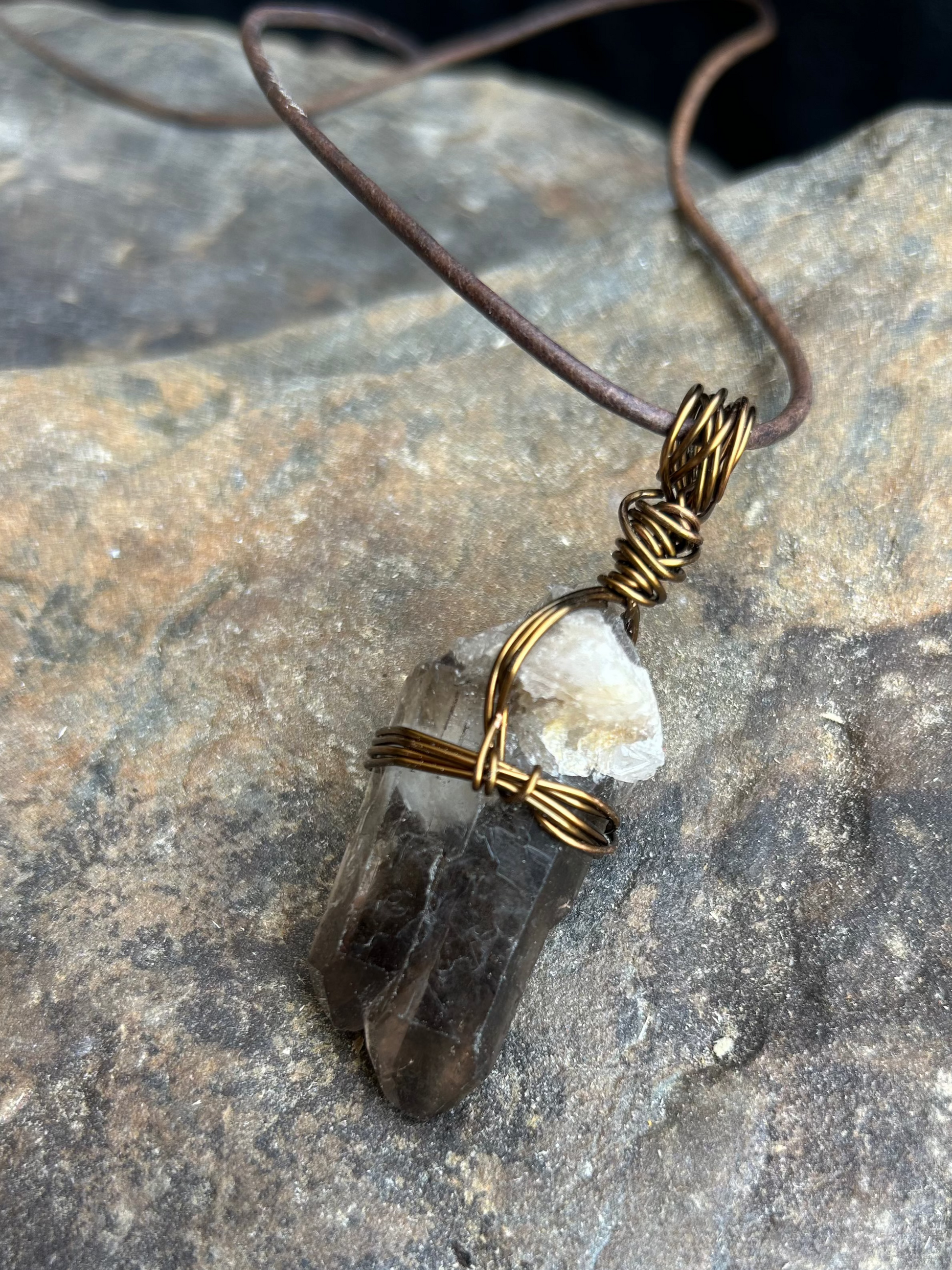 This pendant hangs gracefully from an adjustable leather cord, allowing you to choose the length that best showcases its beauty against your neckline. Whether you're dressing up for a mystical ritual or adding a touch of gothic elegance to your daily wear, this Smokey Quartz pendant is designed to be a versatile and powerful addition to any witchy wardrobe.