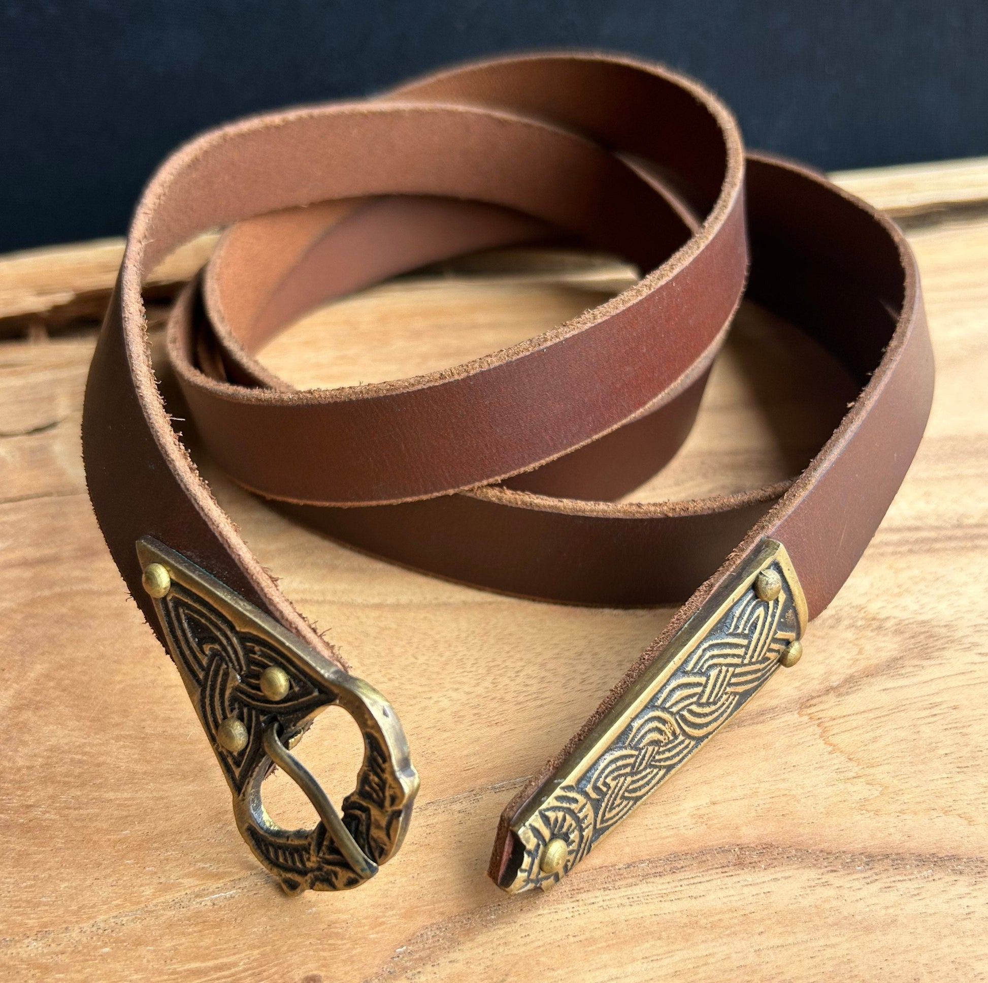 This Viking Leather Belt boasts intricate decorations and measures 7/8" in width and approximately 51" in length. Crafted with a brass buckle and end, it features a holeless design for a unique and practical aesthetic.